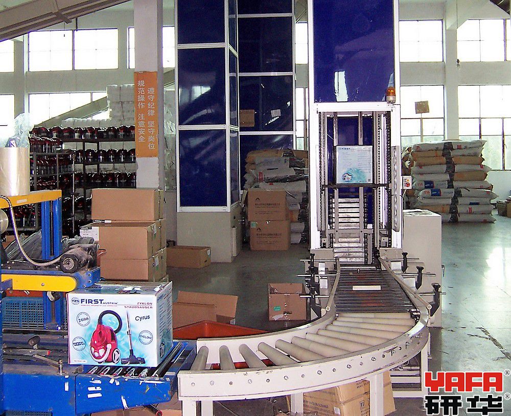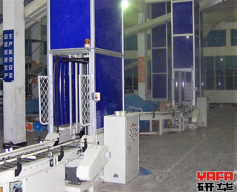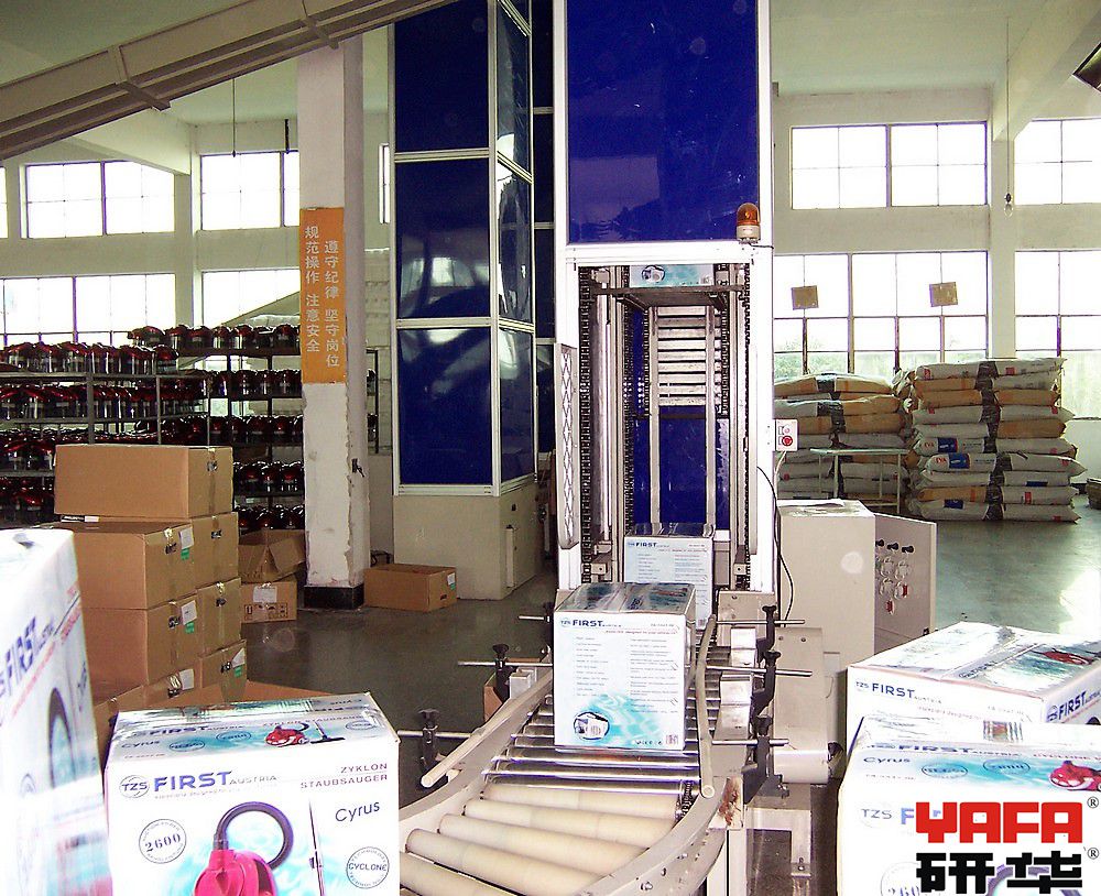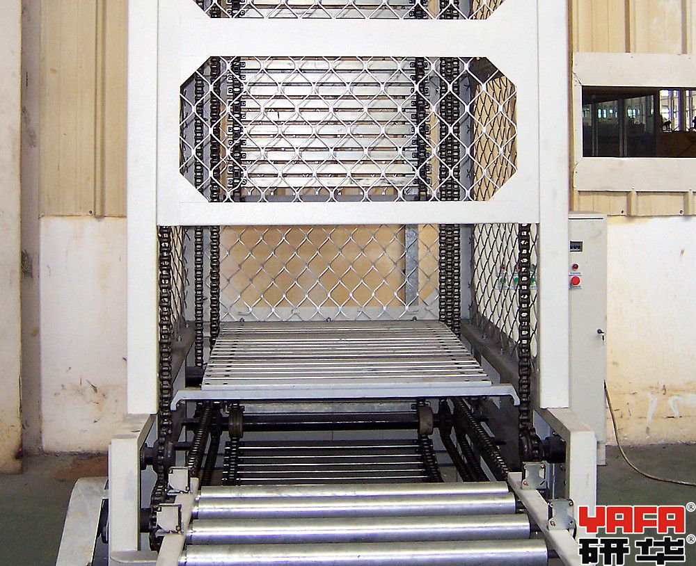 垂直连续提升输送机是依靠四条循环的输送链,分别牵引用于承载货物的托盘的四角,在进、出口的水平运行段,可实现箱体的接收及送出,而在垂直输送通道内,托盘仍保持水平,确保箱体的平稳升、落,在完成送货后的空托盘回程中,托盘沿机架后侧垂直回送,只占用极小的空间,随着多组托盘的循环运行,即可连续地完成货物的垂直输送。