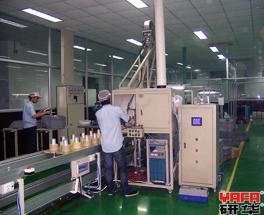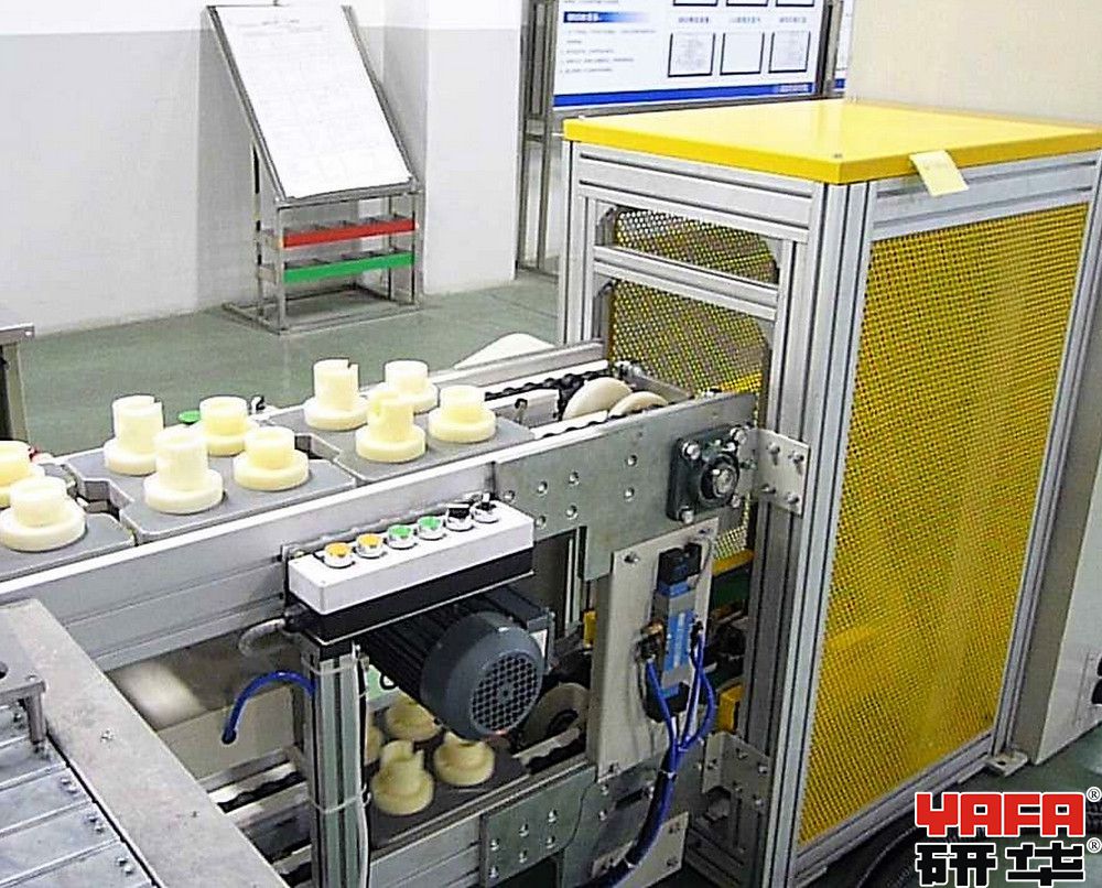 立面环形倍速链输送机具有2条上下平行布局的倍速链输送机。2条输送机的输送方向为相反方向,立面环形倍速链输送机的首尾分别配置一台短行程的线端升降机或长行程的垂直往复提升输送机。工装托盘的纵向运动由倍速链传输,工装托盘输至末端后,在对应的线端升降机或垂直往复提升输送机的接力作用下,自动完成上料端的上下循环和下料端的上下循环工序,实现工装托盘不断的在立面环形运动轨迹中循环,从而连续不断地完成工件的输送工艺。