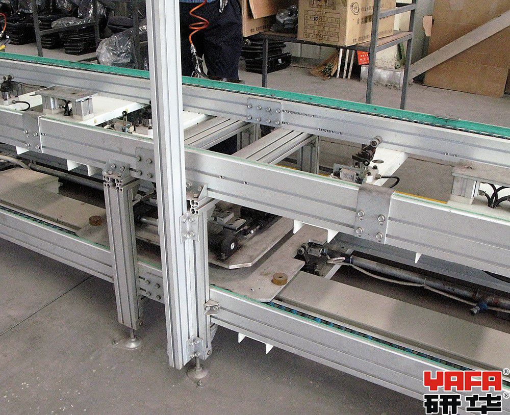 倍速链输送机在众多行业的自动化生产线上得到广泛的应用,主要用在输送线路中物品要求输送速度柔性可控,并且要求被输送物品的底部较结实、平整,如包装箱类、托盘类等,实际使用时以把被输送对象放在工装托盘上居多。一般适用于电子器件和家用电器设备等轻型物件的输送,可用于输送单元负载货物,如栈板、塑料箱,也可利用承载托板来输送其它形状物。若将滚轮和滚子改用钢制件,则也可适用于重载机械部件的输送。